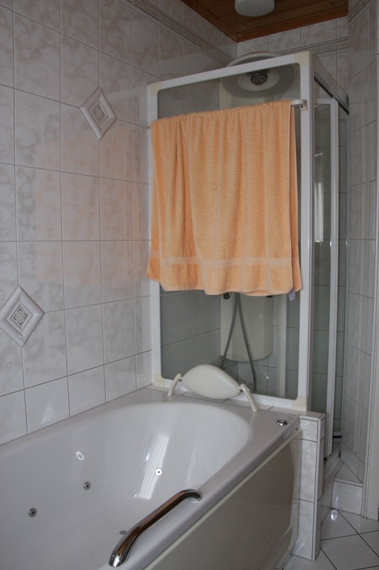 Auf einer Seite Whirlpool-Badewanne und Duschwanne, auf der anderen Seite Wand-WC, Waschbecken und Spiegelschrank.