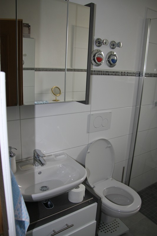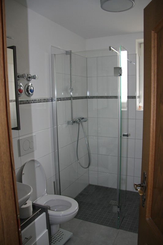 Großzügige, ebenerdige Duschecke mit Echtglas-Duschabtrennung, WC und Waschbecken,sowie Warm- und Kaltwasserzähler seperat für jede Wohneinheit.