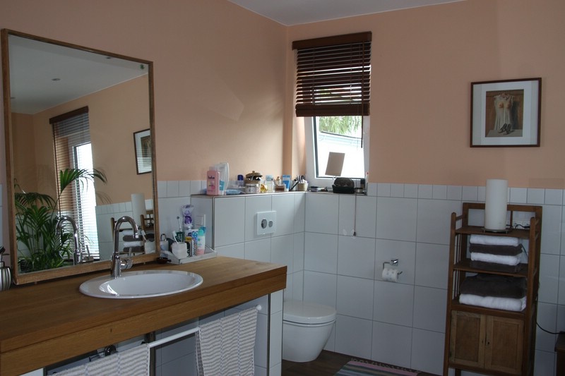 Holz in Verbindung mit Keramik erzeugt eine angenehme Athmosphäre, wie hier ausgeführt.